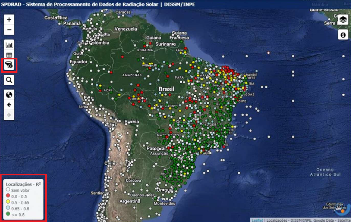 Neste caso, quanto maior o valor de R², mais próximos são os valores de irradiância medidos pelas estações e os estimados pelo modelo GL. No mapa, as estações com R² >= 0,8 estão destacadas com a cor verde, o