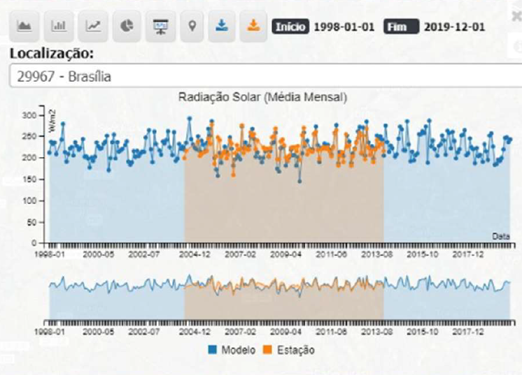 Para cada localização, é possível obter os valores de radiação solar a partir de um clique na feição geográfica. O resultado é recuperado e exibido em um painel, contendo um gráfico estatístico com os valores e o período temporal das medidas.