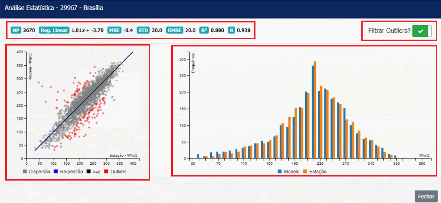 Nota: os outliers são identificados com base na diferença entre os dados do modelo GL e os dados observados na estação. Primeiro, calcula-se o erro médio (MBE) e o desvio padrão (STD) dessas diferenças. Um ponto é considerado outlier se sua diferença, já ajustada pelo MBE, for maior ou igual a duas vezes o desvio padrão. Ou seja:
