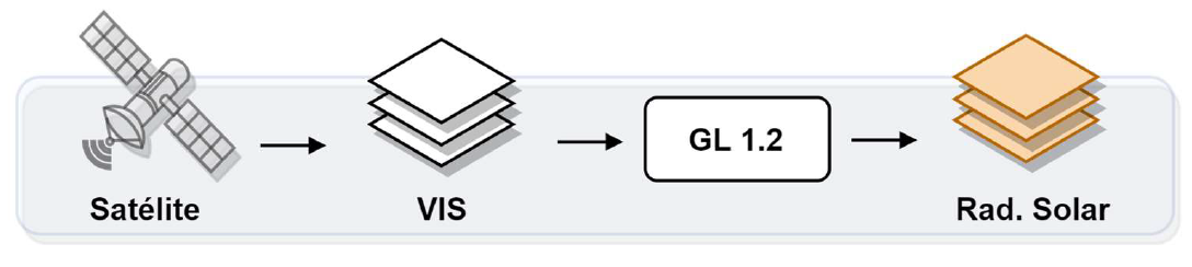O modelo GL 1.2 (Ceballos et al., 2004) opera CPTEC/INPE, processando imagens do canal VIS de satélites GOES (em diferentes instantes de tempo) e gerando matrizes de irradiância solar, com um total de 1800 x 1800 pixels e resolução espacial de 0,04º (grade regular).