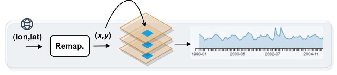 Os valores de irradiância solar são obtidos a partir de uma operação de amostragem por pixel, ou seja, a coordenada geográfica de cada localização de interesse é remapeada para a grande regular produzida pelo modelo GL, em seguida o valor do pixel correspondente é extraído, para cada matriz disponível, dando origem a uma série temporal.