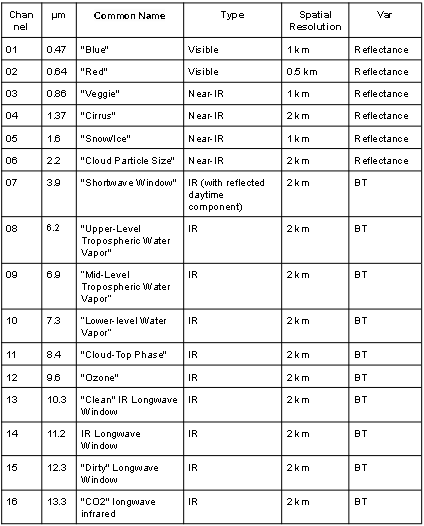 Canal 2,2 μm do sensor ABI/GOES16, que em conjunto com outros canais, possibilita a estimativa do tamanho das partículas da nuvem. Também é utilizado para estimar o tamanho das partículas de aerossol. As imagens obtidas pelo sensor ABI/GOES são utilizadas para monitorar a Terra, a atmosfera e os oceanos. A refletância medida (radiância) dentro das bandas do espectro visível e infravermelho é convertida em valores de brilho e temperaturas de brilho, respectivamente. Esses valores são usados para gerar uma variedade de produtos que auxiliam os meteorologistas e especialistas no monitoramento e na previsão de vários tipos de eventos meteorológicos, do oceano e outros fenômenos relacionados ao clima. Os dados enviados pelo satélite GOES-16 são recebidos em tempo real na estação de recepção localizada no INPE de Cachoeira Paulista, onde são processados e armazenados.