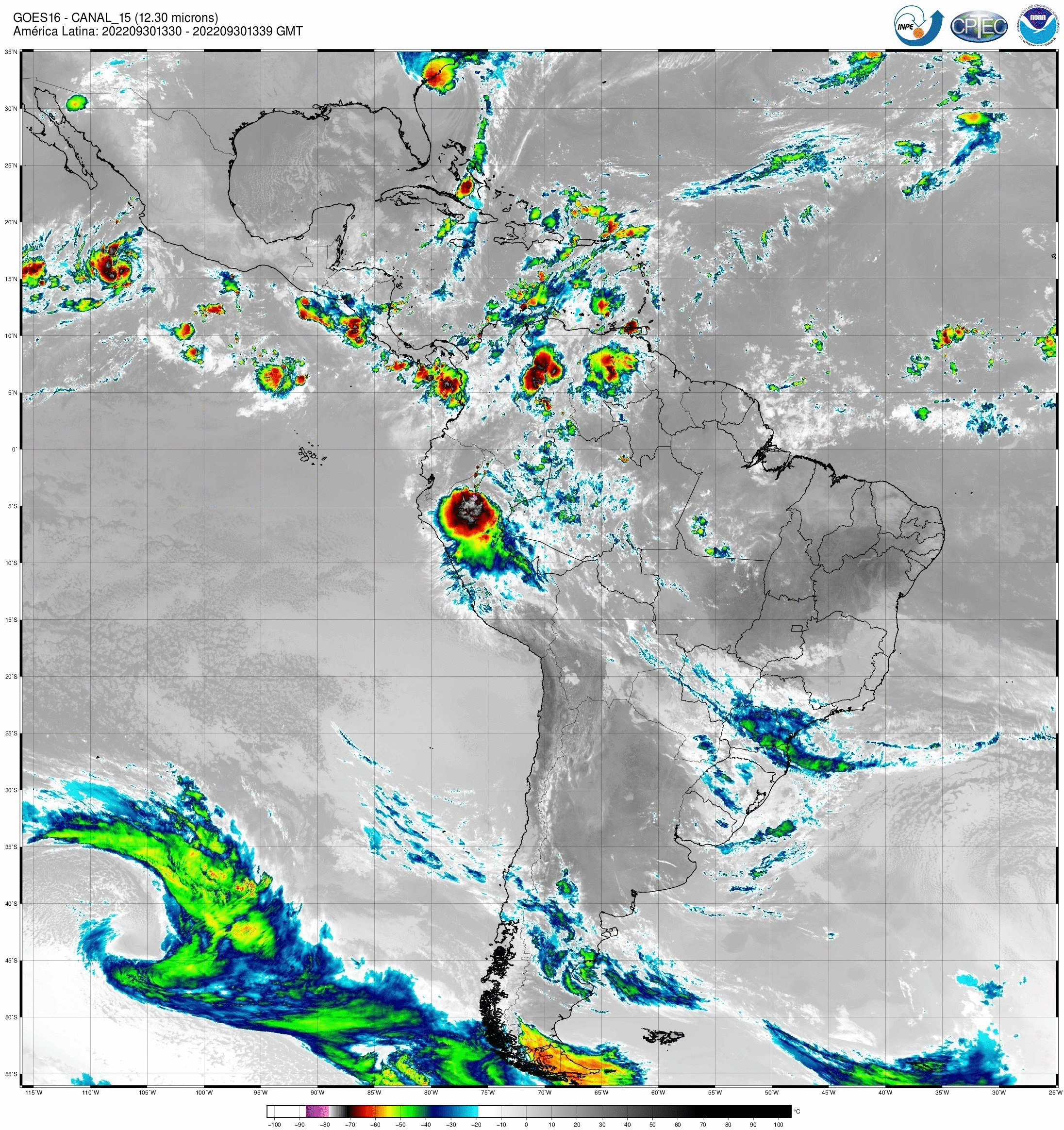 Canal 12,3 μm do sensor ABI/GOES16. Em conjunto com o canal 13, pode ser utilizado para detecção de umidade e poeira, além de diversos outros produtos. As imagens obtidas pelo sensor ABI/GOES são utilizadas para monitorar a Terra, a atmosfera e os oceanos. A refletância medida (radiância) dentro das bandas do espectro visível e infravermelho é convertida em valores de brilho e temperaturas de brilho, respectivamente. Esses valores são usados para gerar uma variedade de produtos que auxiliam os meteorologistas e especialistas no monitoramento e na previsão de vários tipos de eventos meteorológicos, do oceano e outros fenômenos relacionados ao clima. Os dados enviados pelo satélite GOES-16 são recebidos em tempo real na estação de recepção localizada no INPE de Cachoeira Paulista, onde são processados e armazenados.
