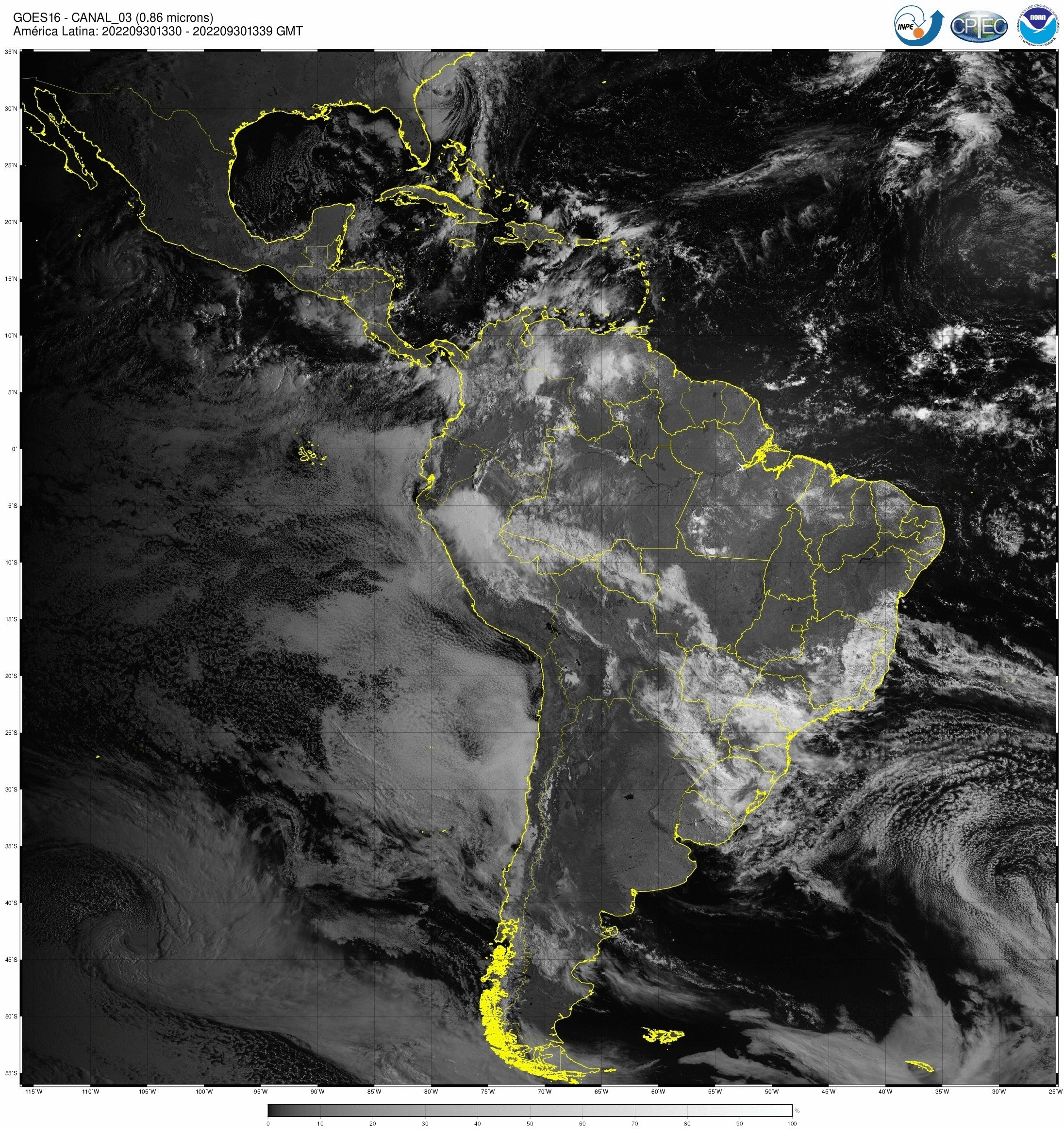 Canal 0,86μm do sensor ABI/GOES16, capaz de detectar nuvens diurnas, neblina e aerossóis. Também é utilizado para calcular o índice de vegetação de diferença normalizada (NDVI). As imagens obtidas pelo sensor ABI/GOES são utilizadas para monitorar a Terra, a atmosfera e os oceanos. A refletância medida (radiância) dentro das bandas do espectro visível e infravermelho é convertida em valores de brilho e temperaturas de brilho, respectivamente. Esses valores são usados para gerar uma variedade de produtos que auxiliam os meteorologistas e especialistas no monitoramento e na previsão de vários tipos de eventos meteorológicos, do oceano e outros fenômenos relacionados ao clima. Os dados enviados pelo satélite GOES-16 são recebidos em tempo real na estação de recepção localizada no INPE de Cachoeira Paulista, onde são processados e armazenados.