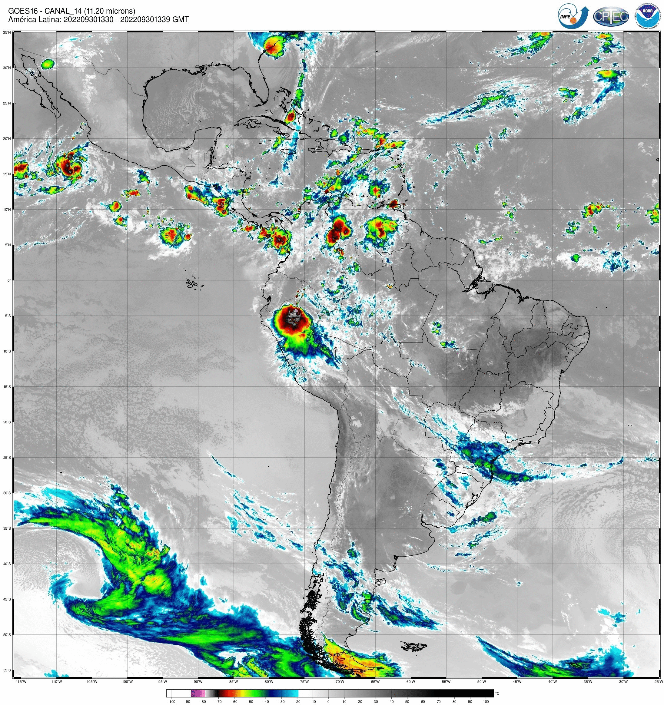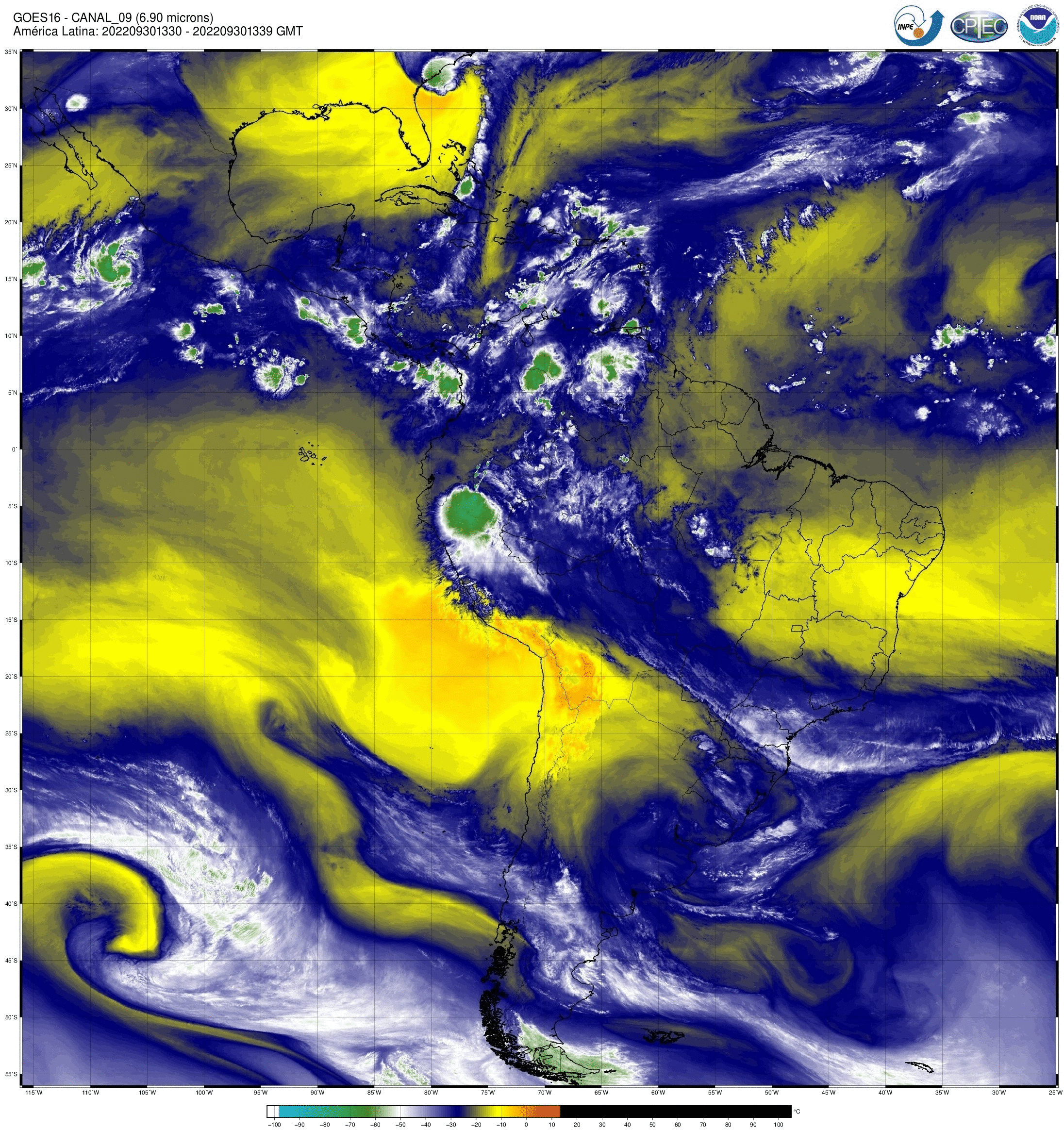 Canal 6,9 μm do sensor ABI/GOES16, um dos 3 canais na banda de absorção do vapor d’água. Tem aplicação na identificação de importantes características atmosféricas. As imagens obtidas pelo sensor ABI/GOES são utilizadas para monitorar a Terra, a atmosfera e os oceanos. A refletância medida (radiância) dentro das bandas do espectro visível e infravermelho é convertida em valores de brilho e temperaturas de brilho, respectivamente. Esses valores são usados para gerar uma variedade de produtos que auxiliam os meteorologistas e especialistas no monitoramento e na previsão de vários tipos de eventos meteorológicos, do oceano e outros fenômenos relacionados ao clima. Os dados enviados pelo satélite GOES-16 são recebidos em tempo real na estação de recepção localizada no INPE de Cachoeira Paulista, onde são processados e armazenados.