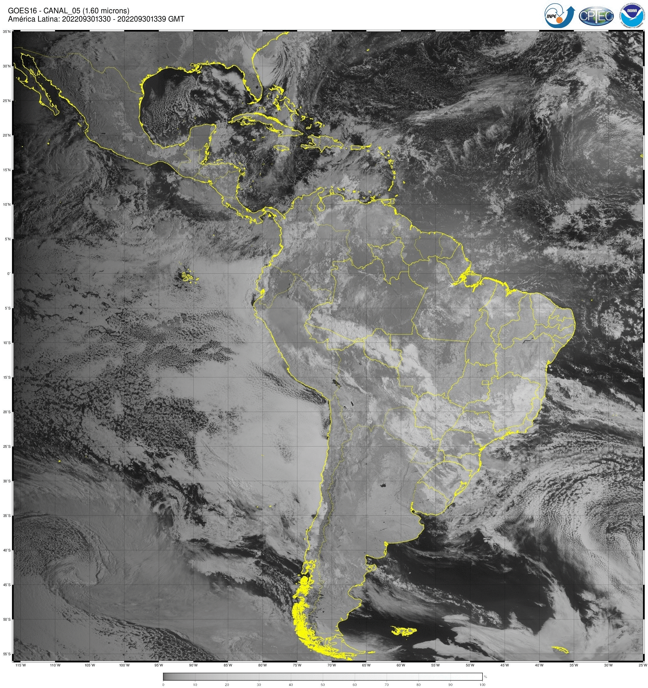Canal 1,6 μm do sensor ABI/GOES16, geralmente utilizado para identificar regiões de gelo ou neve, além de focos de incêndio no período noturno. As imagens obtidas pelo sensor ABI/GOES são utilizadas para monitorar a Terra, a atmosfera e os oceanos. A refletância medida (radiância) dentro das bandas do espectro visível e infravermelho é convertida em valores de brilho e temperaturas de brilho, respectivamente. Esses valores são usados para gerar uma variedade de produtos que auxiliam os meteorologistas e especialistas no monitoramento e na previsão de vários tipos de eventos meteorológicos, do oceano e outros fenômenos relacionados ao clima. Os dados enviados pelo satélite GOES-16 são recebidos em tempo real na estação de recepção localizada no INPE de Cachoeira Paulista, onde são processados e armazenados.