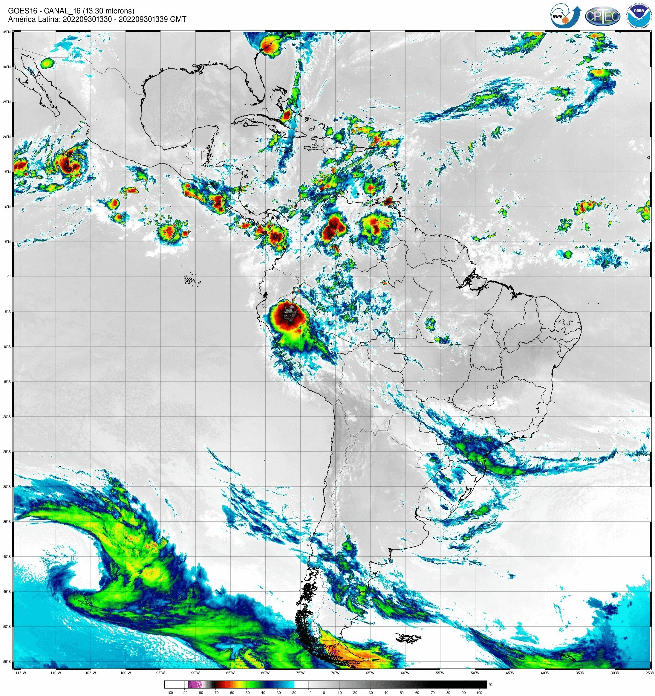 Canal 13,3 μm do sensor ABI/GOES16, tem principal aplicação na estimativa da temperatura média do ar troposférico, além de outros produtos quando combinado com outros canais. As imagens obtidas pelo sensor ABI/GOES são utilizadas para monitorar a Terra, a atmosfera e os oceanos. A refletância medida (radiância) dentro das bandas do espectro visível e infravermelho é convertida em valores de brilho e temperaturas de brilho, respectivamente. Esses valores são usados para gerar uma variedade de produtos que auxiliam os meteorologistas e especialistas no monitoramento e na previsão de vários tipos de eventos meteorológicos, do oceano e outros fenômenos relacionados ao clima. Os dados enviados pelo satélite GOES-16 são recebidos em tempo real na estação de recepção localizada no INPE de Cachoeira Paulista, onde são processados e armazenados.
