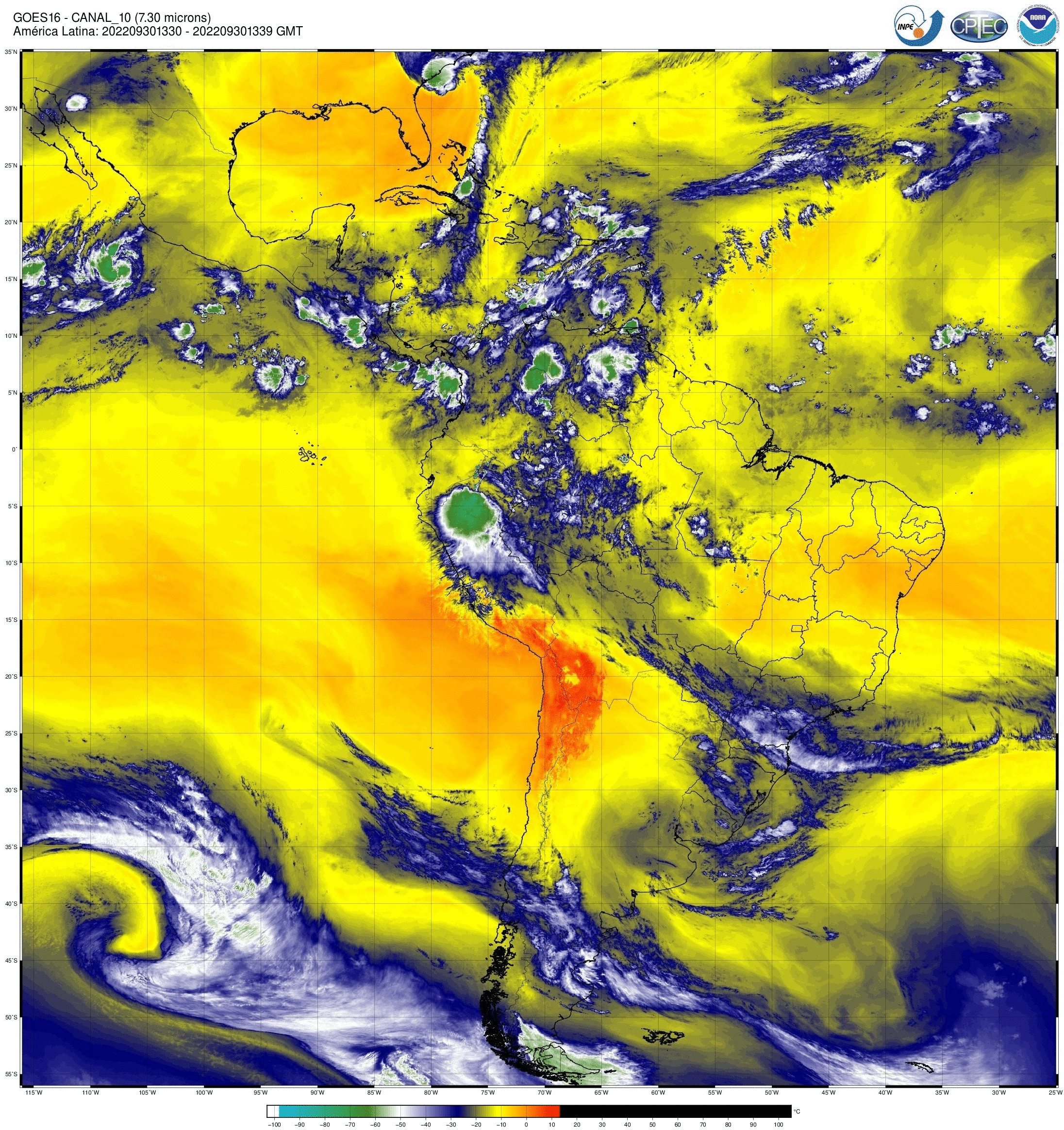 Canal 7,3 μm do sensor ABI/GOES16, um dos 3 canais na banda de absorção do vapor d’água. Tem aplicação na identificação de importantes características atmosféricas. As imagens obtidas pelo sensor ABI/GOES são utilizadas para monitorar a Terra, a atmosfera e os oceanos. A refletância medida (radiância) dentro das bandas do espectro visível e infravermelho é convertida em valores de brilho e temperaturas de brilho, respectivamente. Esses valores são usados para gerar uma variedade de produtos que auxiliam os meteorologistas e especialistas no monitoramento e na previsão de vários tipos de eventos meteorológicos, do oceano e outros fenômenos relacionados ao clima. Os dados enviados pelo satélite GOES-16 são recebidos em tempo real na estação de recepção localizada no INPE de Cachoeira Paulista, onde são processados e armazenados.