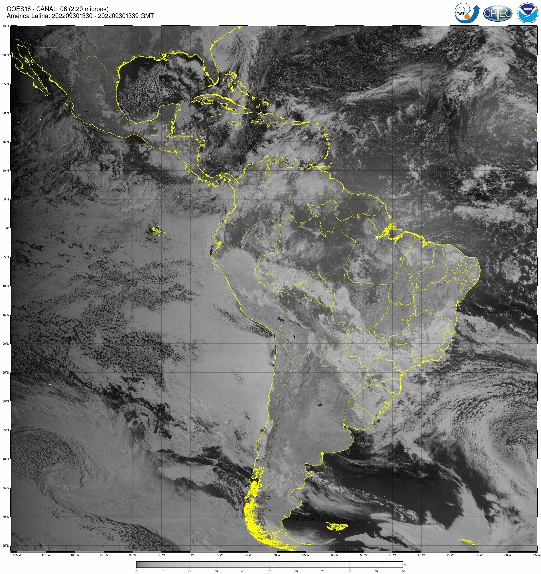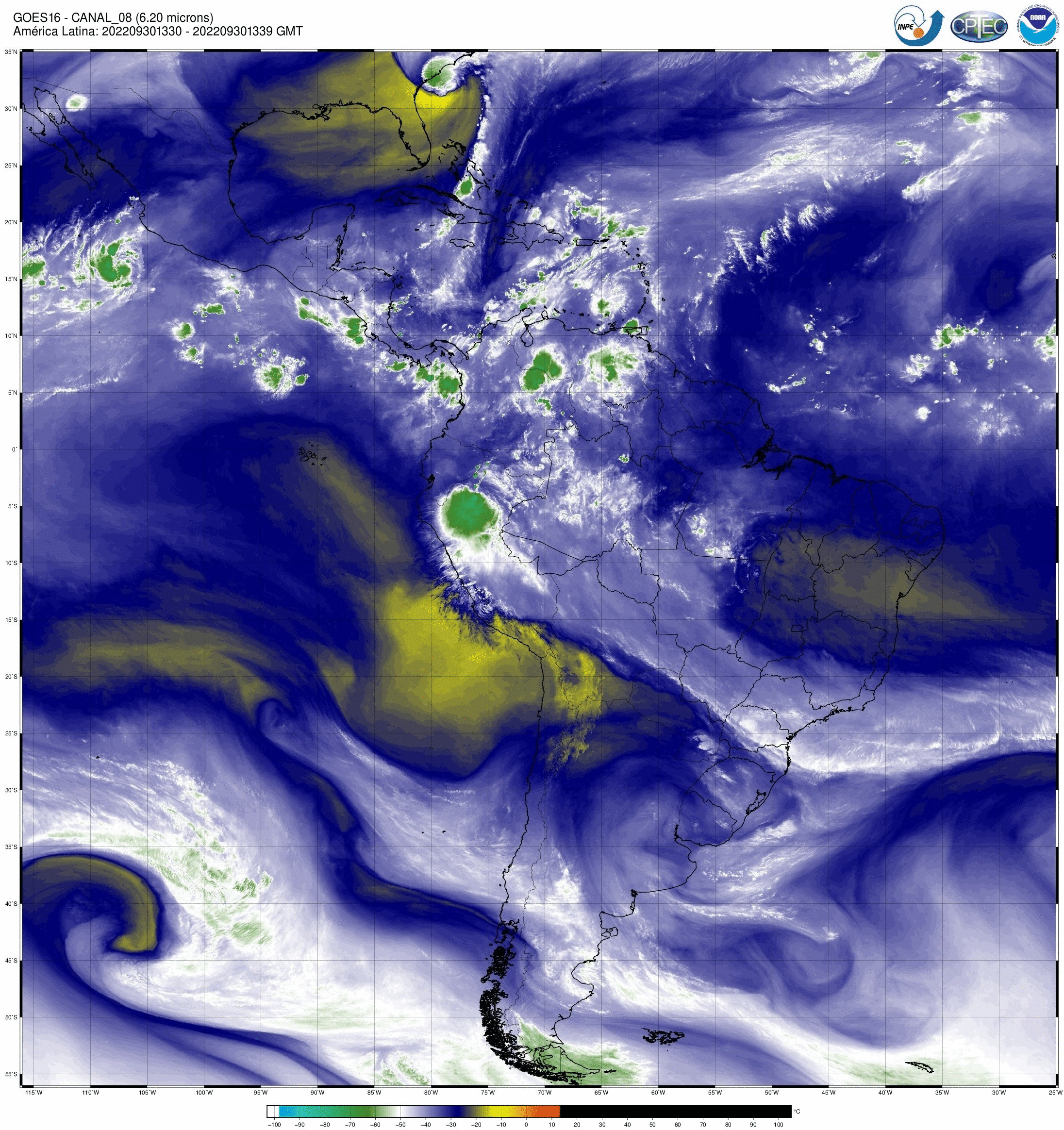 Canal 6,3 μm do sensor ABI/GOES16, um dos 3 canais na banda de absorção do vapor d’água. Tem aplicação na identificação de importantes características atmosféricas. As imagens obtidas pelo sensor ABI/GOES são utilizadas para monitorar a Terra, a atmosfera e os oceanos. A refletância medida (radiância) dentro das bandas do espectro visível e infravermelho é convertida em valores de brilho e temperaturas de brilho, respectivamente. Esses valores são usados para gerar uma variedade de produtos que auxiliam os meteorologistas e especialistas no monitoramento e na previsão de vários tipos de eventos meteorológicos, do oceano e outros fenômenos relacionados ao clima. Os dados enviados pelo satélite GOES-16 são recebidos em tempo real na estação de recepção localizada no INPE de Cachoeira Paulista, onde são processados e armazenados.