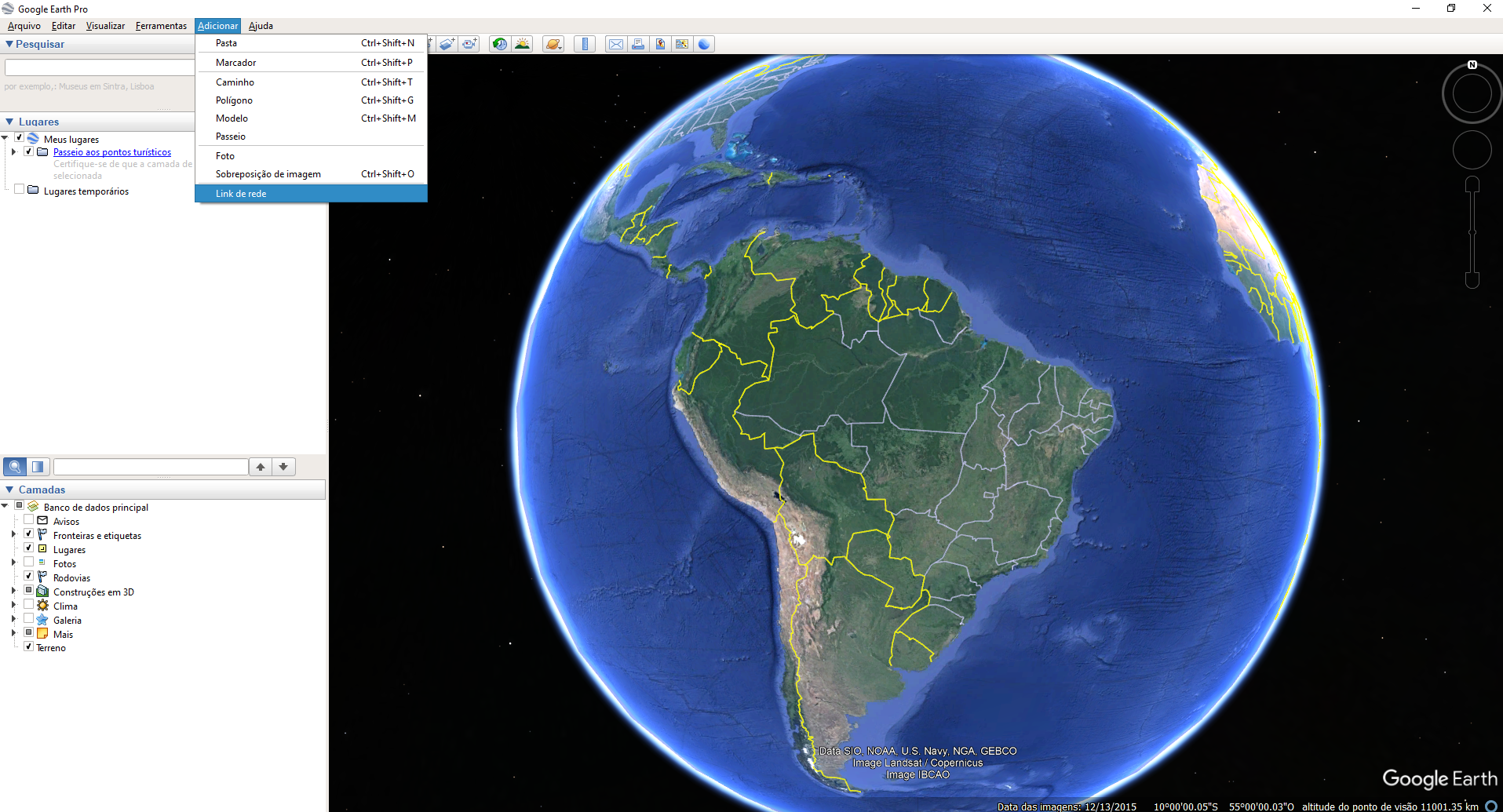 Ao abrir o Google Earth, no menu, selecionar: Adicionar > Link de Rede.